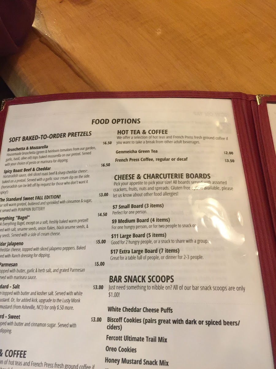 Introducing Fercott Fermentables, a hidden gem nestled in Lenoir, NC, at 107 N Main St. This delightful venue is not just a brewery; it’s a hub for wine and craft beer enthusiasts. You can indulge in an exquisite selection of wines, featuring standout bottles like the Poppy Cabernet Sauvignon and The Prisoner "Saldo" Zinfandel. The menu is beautifully complemented by a range of artisanal side items, from Kale Chips to Bourbon Honey, and a diverse charcuterie selection including Aged Gouda and Classic Goat Chevre.
